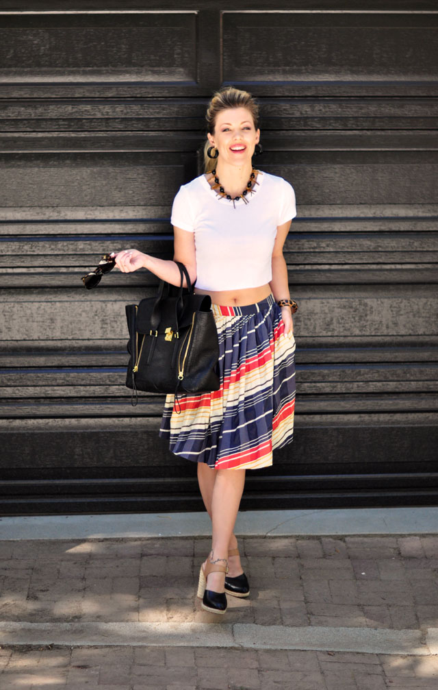 Soooo crop tops are back… and while the new trend is typically worn with a shorter top and a higher waisted bottom to cover the navel, this old skirt sits a bit lower on the waist… and though I’m not exactly sure it’s age-appropriate, that line and term are sort of blurred as well. And while my stomach isn’t in as great of shape as I’d like it to be, the outfit was still fun to wear. It felt very Dolce and Gabbana to me and was fun and Summery for the first day of Summer.