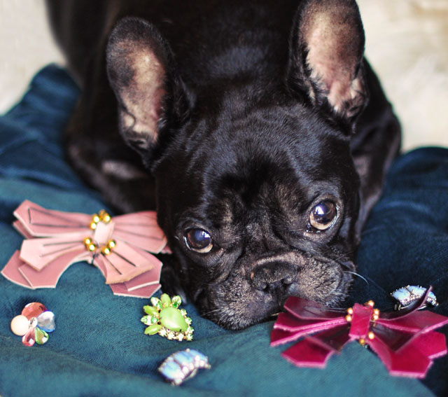 Flipping through my September issue of Bazaar from back to front, the way I always read magazines, I quickly spotted this gorgeous deep teal dress covered with small and large critters from the Lanvin Fall 2013 RTW collection and fell in love. While some of the critters are made of large gem stones, sewn directly to the fabric, the butterflies looked as if they were just pinned on. I thought why not make actual butterfly pins out of old scrap leather and then I can wear them wherever I want to {like in my hair}. That’s the great thing about pins and brooches, you can literally pin them to anything.